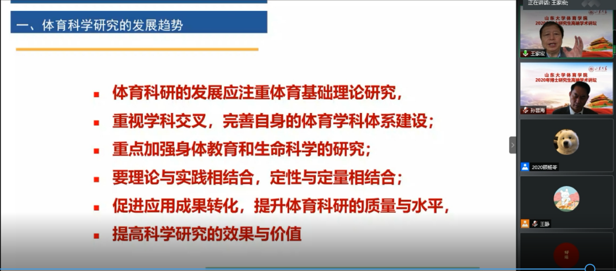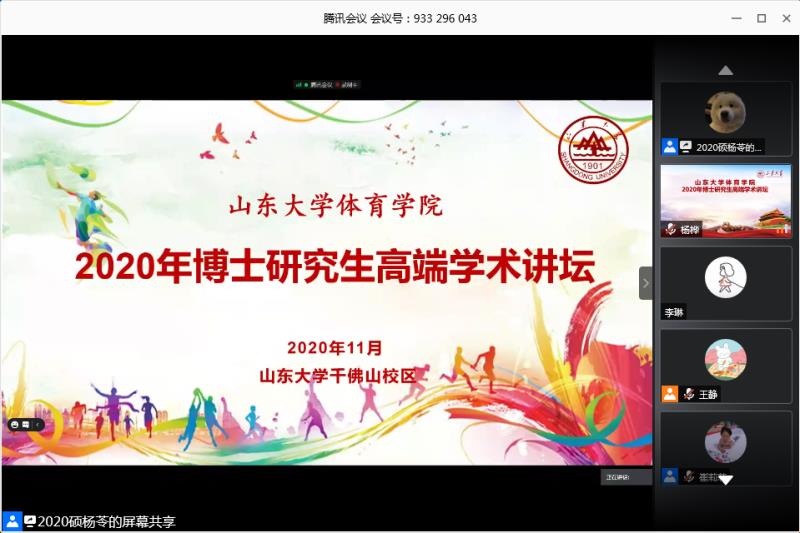 11月16日,yL23411永利官网登录举办的“2020年博士研究生高端学术讲坛”落下帷幕。本次学术讲坛邀请了多位国内知名专家学者,围绕体育哲学社会科学研究现状与发展趋势、健康与人格培养相融、体育科研论文的撰写规范、体育学科的发展与体育科研的趋势、智慧健身综合服务的数字逻辑与应用实践、体育口述历史在中国、运动员退役安置系统特征、演化及调控机制-基于复杂适应系统理论等,开展了广泛而深入的学习研讨,旨在进一步提升我校体育学研究生的教学质量和科研水平,不断拓宽学生的学术视野。