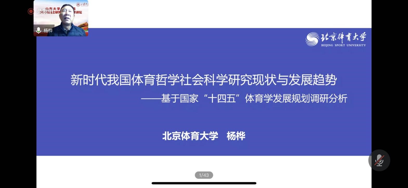11月3日上午,邀请了北京体育大学教授、博士生导师,原北京体育大学党委书记、校长杨桦教授进行题为“新时代我国体育哲学社会科学研究现状与发展趋势——基于国家‘十四五’体育学发展规划调研分析”的专题讲座。杨桦教授分别从2016-2020年国家社科和教育部人文社会科学研究课题立项的数量、立项地区、出版著作、智库建设等方面进行总体介绍。杨桦教授提出“十三五”期间体育学主要二级学科日臻成熟,分别讲授了其学科的研究议题和研究进展。其次提出“十三五”期间我国体育哲学社会学研究存在一些问题并详细讲授了体育文化学等十大领域的学术前沿和发展趋势。随后,杨桦教授对“十四五”时期我国体育学哲学社会科学重点研究领域——国民健康素养与健康促进研究等进行了详细地讲解。
