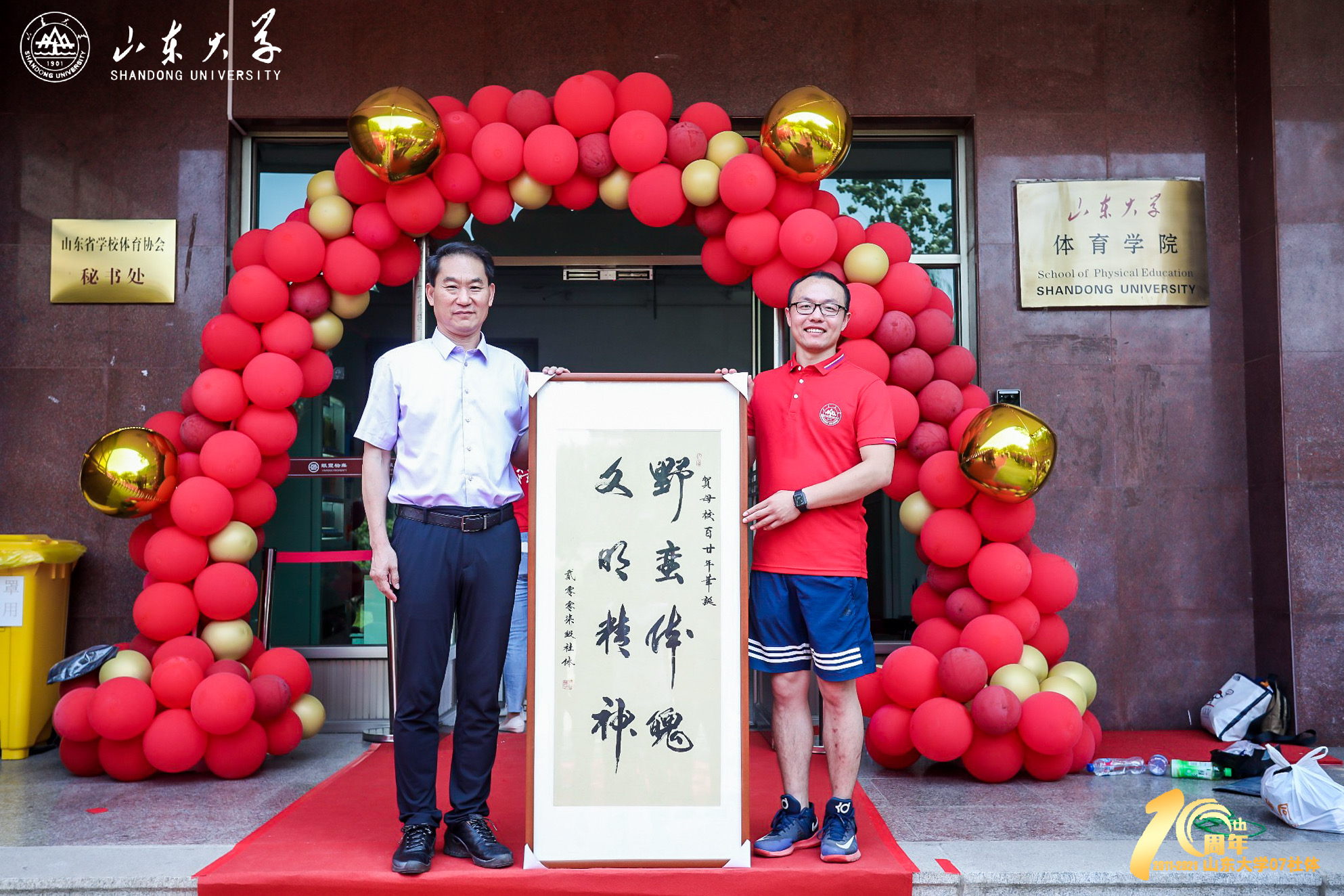 返校典礼上,07级社体全体校友将朱耀瑛先生亲手书写的“野蛮体魄,文明精神”的书法作品赠予母院,表达自己对母院的感恩与祝福。交接仪式后,出席活动的领导及教师代表与返校校友们合影留念。