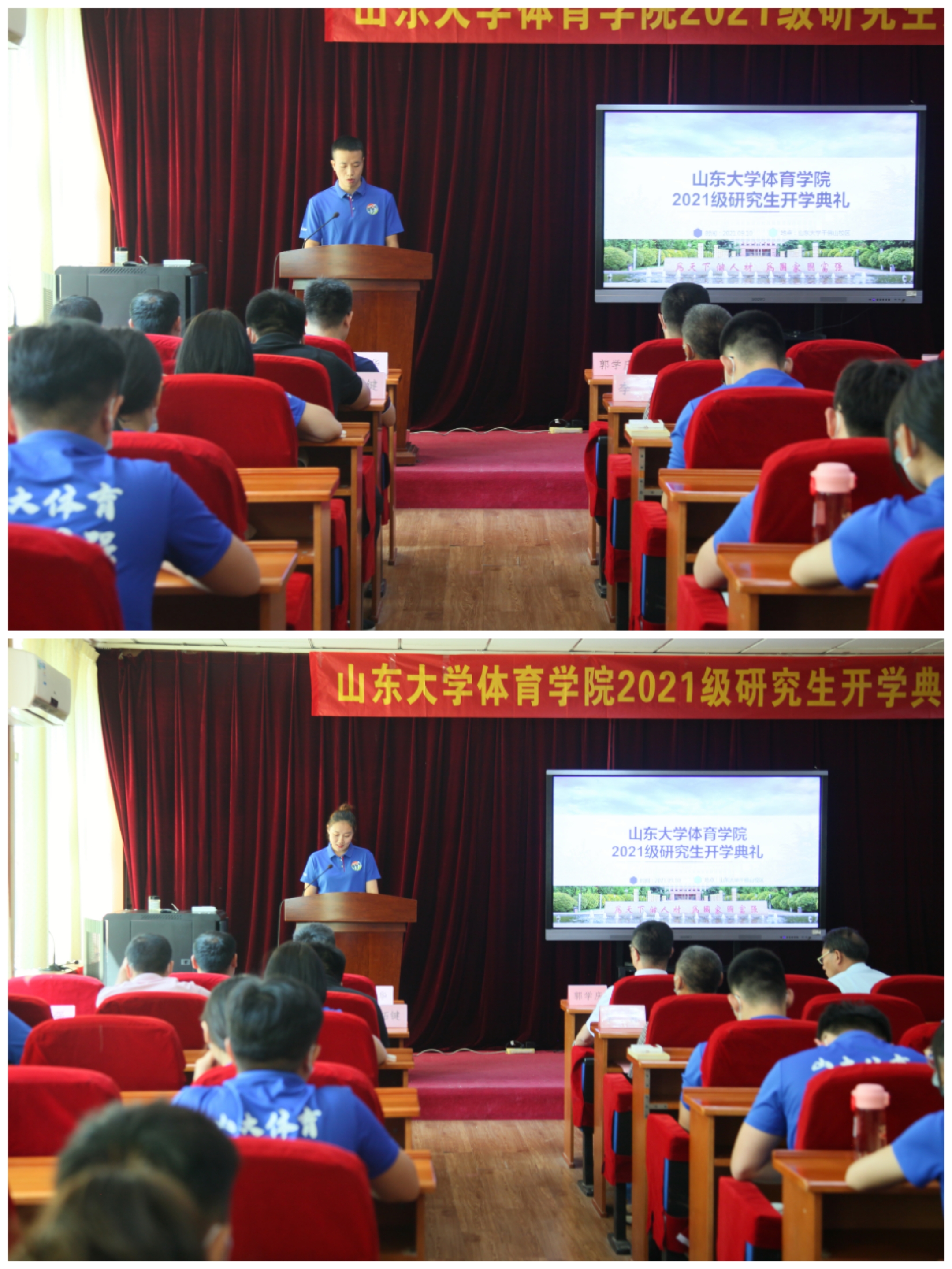 典礼上,郭学庆给全体新生开展了校史院情教育活动,介绍了学校和学院自成立以来发展的各阶段成果。石振国介绍了我院研究生的教育培养管理的各个方面,同时要求所有学生要养成“好读书、读好书、读好书”的良好习惯,进一步阐述了“为什么读书、读什么样的书,怎样读书”的初衷试命,他同时积极鼓励大家积极参与学院“T语堂”系列活动,积极参加学术讲座和学术沙龙,在导师指导下,不辱使命、不虚此行。周庆华就研究生思政教育及日常事务管理做了简单介绍,他希望同学们在研究生阶段积极与导师沟通,加强安全意识和自我教育、自我调节的能力。博士研究生巫前锦和硕士研究生刘惠淼分别代表2021级博士新生和2021级硕士新生发言。他们都表达了进入yL23411永利官网登录的荣幸和激动,希望未来以老师、师哥师姐们为榜样,努力奋斗、团结友爱,秉承校训精神,学无止境,气有浩然。王先亮老师作为导师代表在典礼上发言,他提到,近些年yL23411永利官网登录在师生共同努力下,发展迅速,成果斐然。同时,从导师的角度,提出了“三项目标、三条路径、三大举措”,激励同学们在学术道路上,顽强拼搏、锐意进取、积极创新,做一个优秀的体育人,为体育学科发展贡献自己的青春。