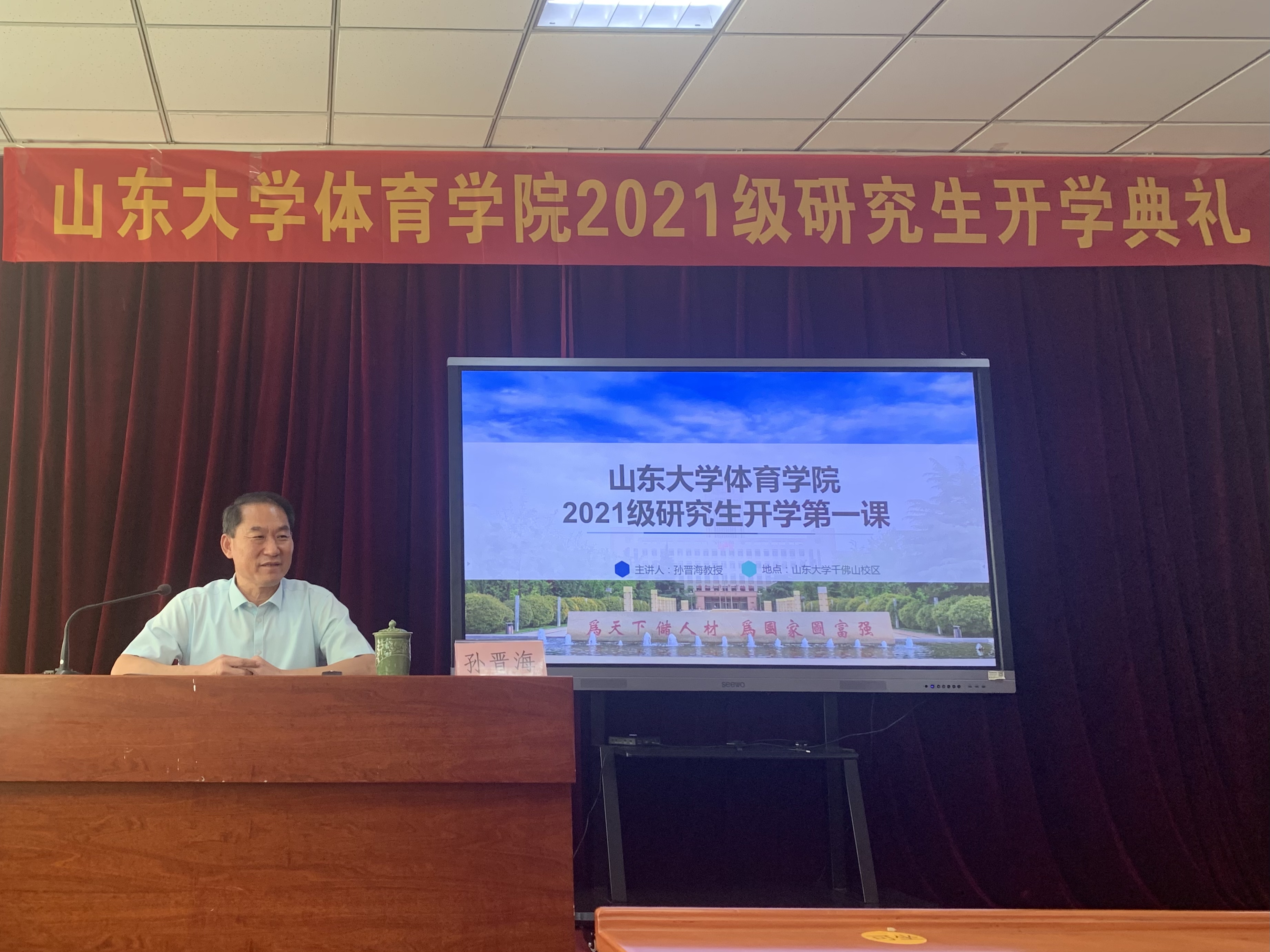 典礼结束后,孙晋海为新生上开学第一课。他提出,研究生要以讨论思维、发散思维、解决问题为主。主要从三个方面入手:第一,引导性讲述。在进行研究时以问题为抓手,探究事物的性质、特点、规律,追根溯源才能探寻真理;第二,如何发现问题。首先要将问题从大化小,阅读大量文献以进行知识储备,分类建立自己的问题库,带着问题去学习;第三,如何解决问题。首先要思考问题,研究与问题相关学科的知识理论,进行学科交叉学习。其次,搞清、剖析问题,分解问题的过程就可形成论文的基本框架,最重要的是要寻找每个问题解决的方法和途径。孙晋海与新生们就“如何提出问题”展开讨论。最后,孙晋海对研究生新生提出要求:要做一个充满学术问题的学生,成为最具创造力的研究生、合格的社会主义接班人。