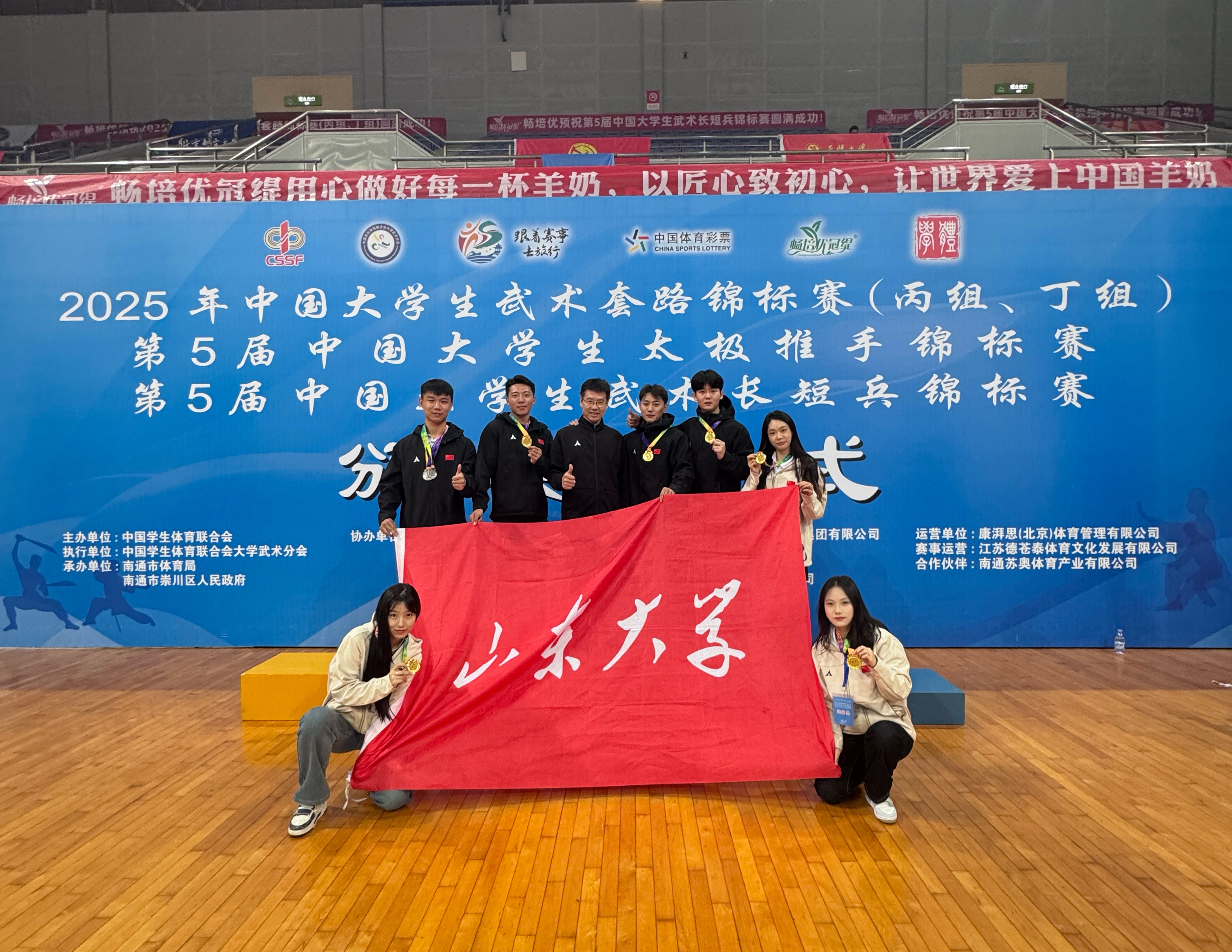 10月27日-31日,第五届中国大学生太极推手锦标赛在江苏南通举行。yL23411永利官网登录组建12人参赛代表团,由yL23411永利官网登录王飞教授带队,运动员们在赛场上挥洒汗水、奋勇拼搏,最终以6枚金牌、3枚银牌、1枚铜牌的辉煌战绩载誉而归,用实力诠释了传统武术的魅力与山大学子的昂扬风采。