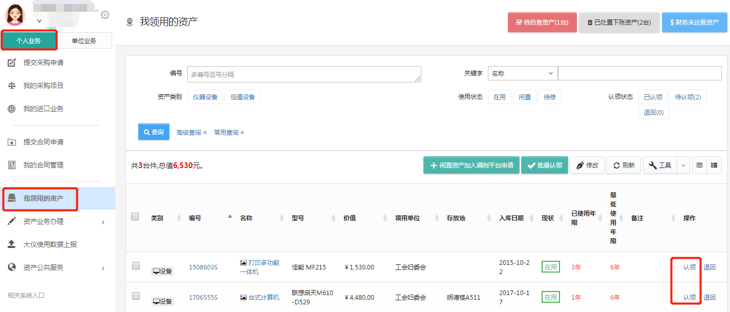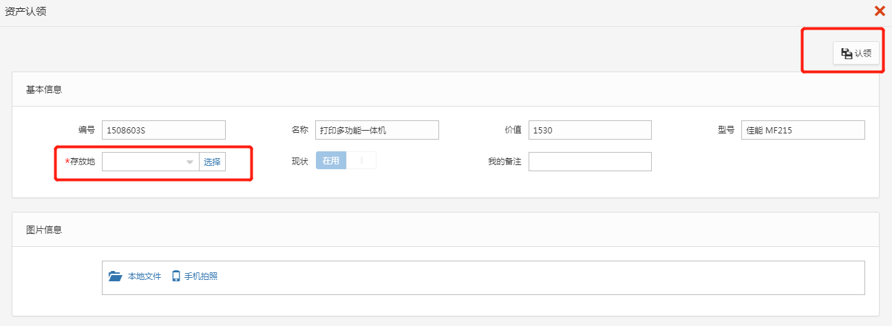 在“个人业务”的“我领用的资产中”点击“认领”,在弹出认领界面中完善“存放地”信息后,点击右上方的“认领”即可。显示如下: