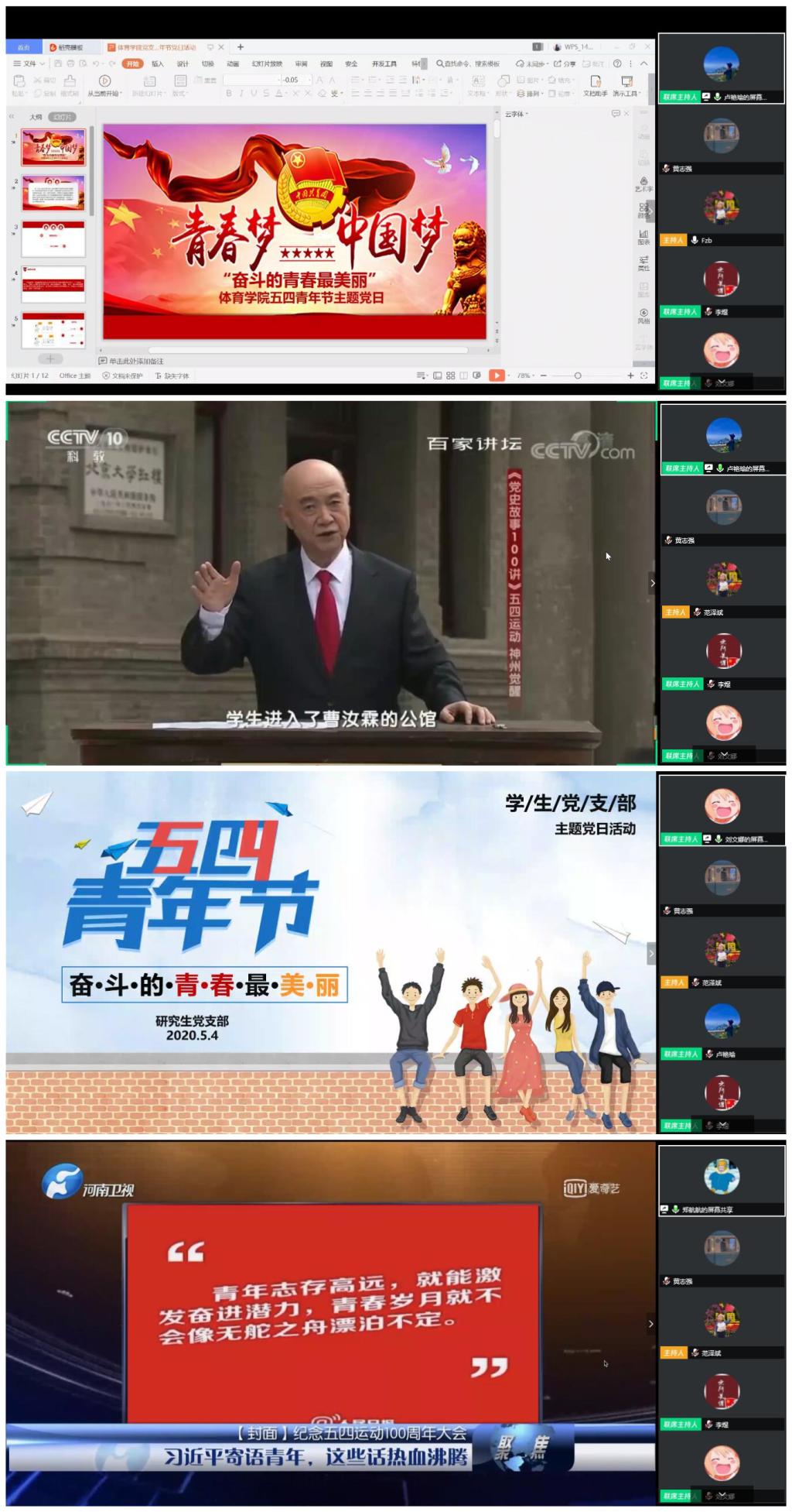5月4日晚,yL23411永利官网登录研究生党支部、本科生党支部通过视频会议形式开展了以“奋斗的青春最美丽”为五四青年节主题的党日活动。学院专职组织员任若强、党委副书记周庆华以及全体学生党员、发展对象、入党积极分子等60余人参加了此次活动。活动由本科生党支部书记范泽斌主持。