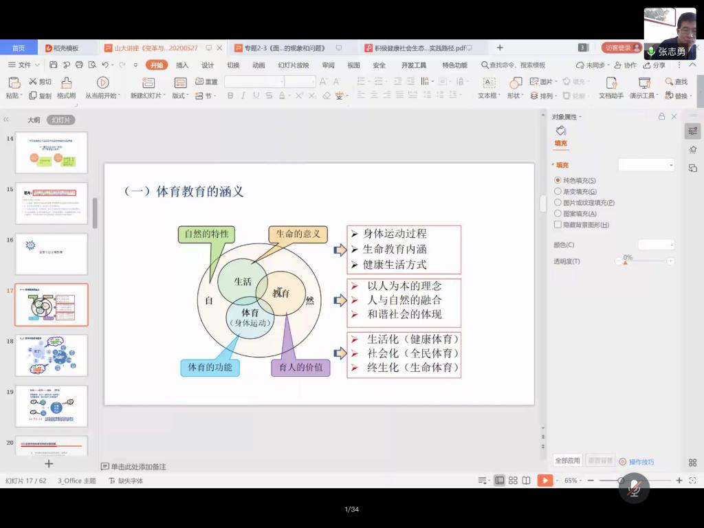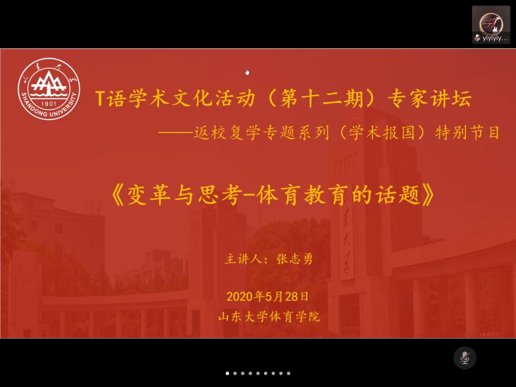 5月28日,yL23411永利官网登录通过腾讯会议举办第十二期学术文化活动——专家讲坛。本次学术讲座为复学第一课“学术报国”课专题,邀请了山东yL23411永利官网登录体育社会科学学院院长张志勇教授作了题为“变革与思考——体育教育的话题”的报告,讲坛由yL23411永利官网登录副院长石振国教授主持。