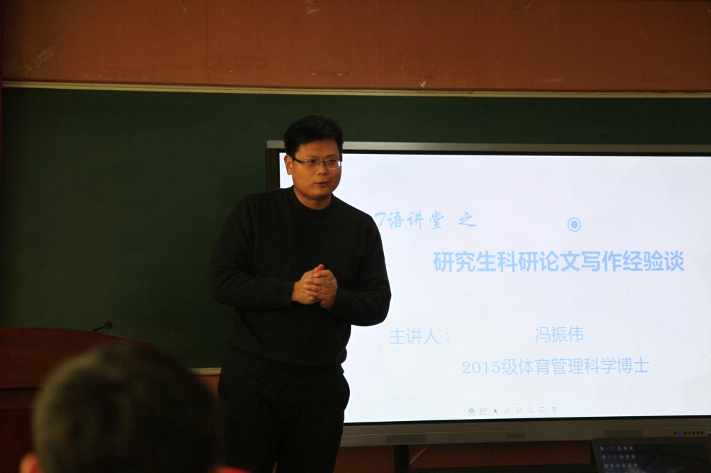冯振伟将论文的选题划分为国家社科基金立项导向、期刊发文导向、健康中国2030政策导向以及国家十三五规划导向,并为大家解读了《武汉yL23411永利官网登录学报》《体育学刊》《沈阳体育学报》等核心期刊,分析了各个期刊中选题的规律。他鼓励大家阅读大量的论文,学习优秀文章的架构,在借鉴他人研究的基础上,构建自己的文章框架。同时,冯振伟提到要在文章中构建二级标题及小标题,标题之间可以是并列关系、递进关系、因果关系等。此外,他认为论文的写作还需要注意写作规范。论文的表达需要采用学术语言,尤其是题目和摘要部分,一方面要表达清楚,另一方面要具有新意;高质量的论文不仅学术水准高,而且具有传播性、创新性及规范性等共同特征。此外,冯振伟针对研究生的学习定位与未来发展方面进行了阐述。他认为研究生应该是技能与科研并存的优秀人才,要重视科研、勇于担当、具有自信并努力刻苦。